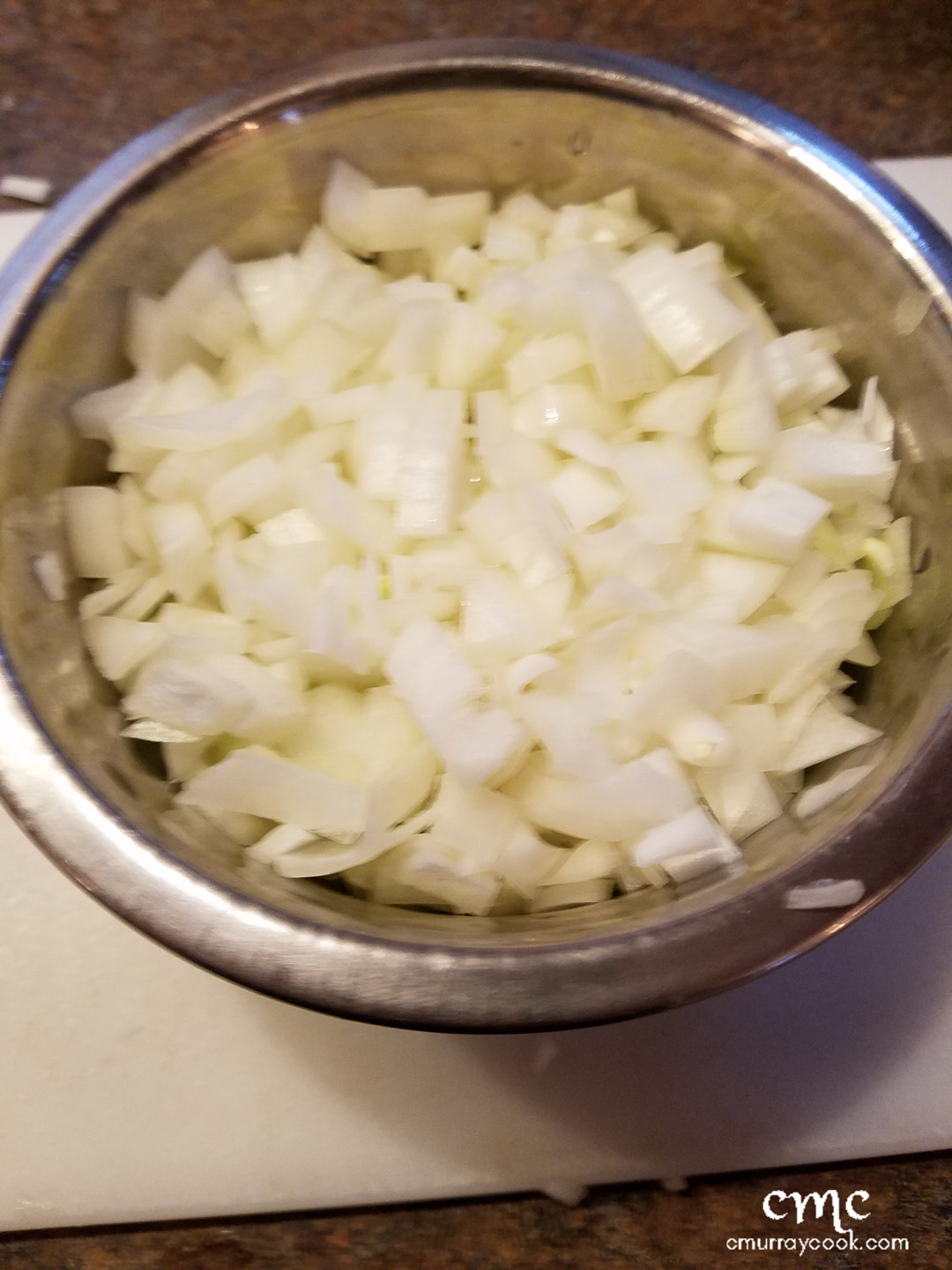 Start by dicing some onion and some bacon, and fry them together over medium heat in a deep skillet. It’s going to reduce down eventually, but that will take a while. Stir it to prevent sticking. I was cooking something else at the same time, but that’s another post for later. Eventually (it took me over half an hour, but I was using a small burner), the bacon will crisp up and the onions will be a translucent brown, like this: