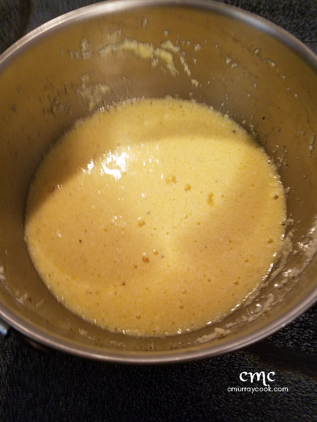In another bowl, mix the eggs and cheese. I usually use a fork because it is easier to clean than a whisk. I like to crack a bunch of pepper into this mixture and then combine that too. Set this aside — you’re going to need it later, but right now it can just sit there and look yellow.