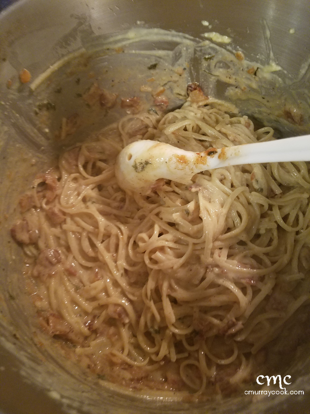The sauce should be, to borrow a phrase from The Sims 3, “goopy”. There should be a small amount of creamy liquid in the pot. Some people see this creamy liquid and think “I should add cream”. These people are wrong. I mean, I’m sure it’s tasty and all, but that seems like it would be almost too rich to eat.