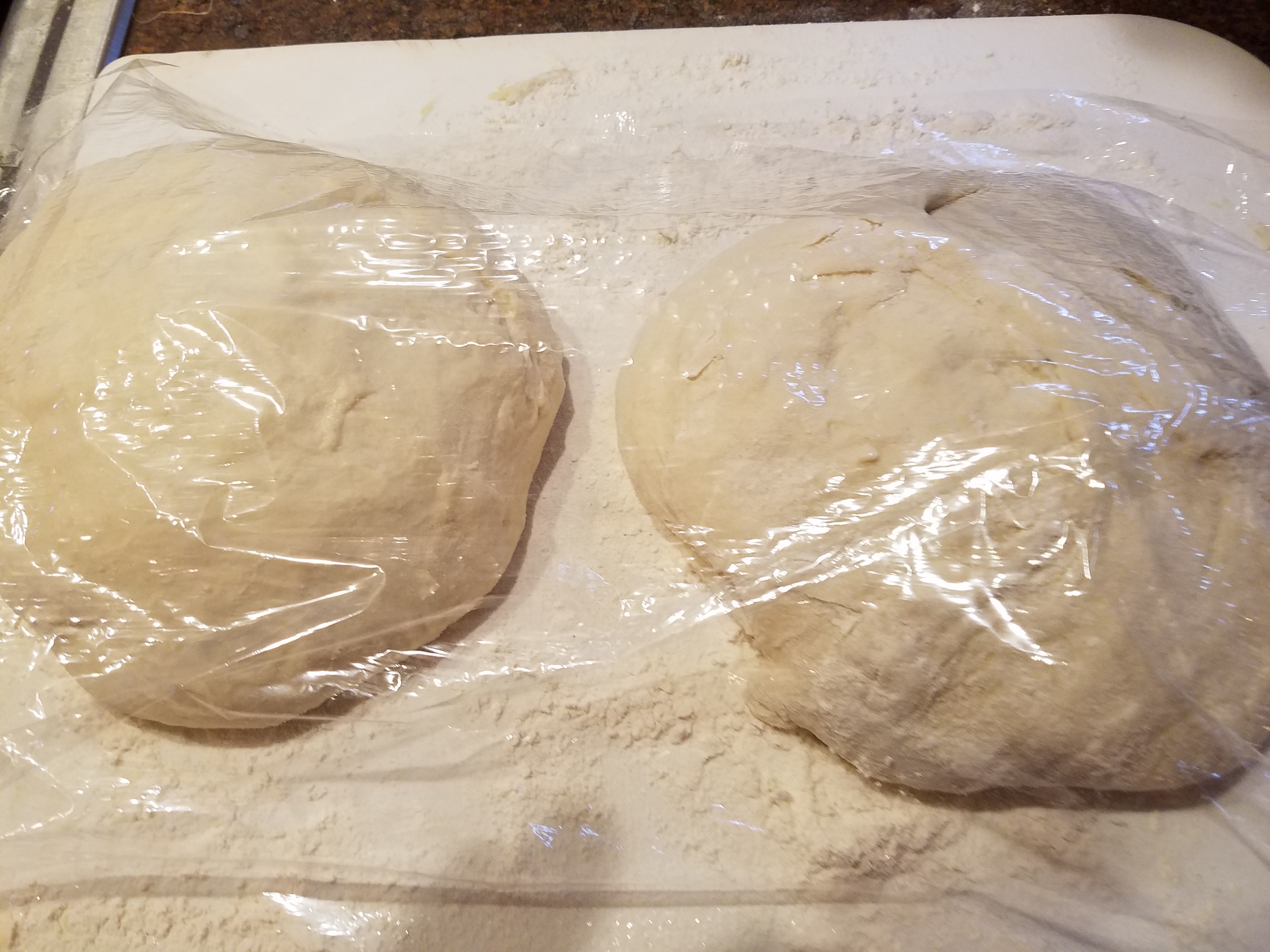 After that rise, I turned the dough back out onto the floured cutting board, divided it in half, and shaped each half vaguely into a circle. I covered the proto-loaves with plastic wrap and wandered off again for 20 minutes this time.